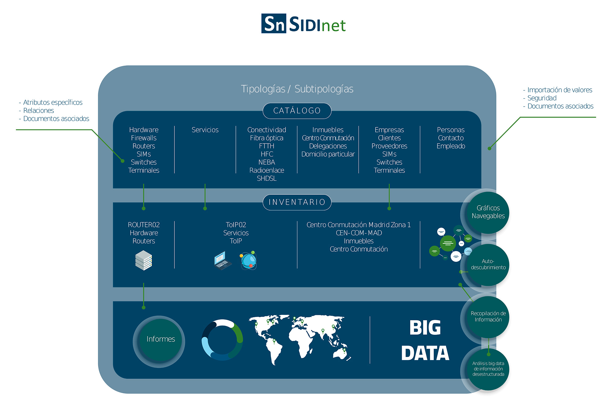 A diferencia de otras plataformas y soluciones, además de inventariarlos, SIDInet dispone de un proceso de autodescubrimiento, los relaciona automáticamente y captura la información proveniente de dichos dispositivos para su análisis y toma de decisiones. Esto convierte a SIDInet en una plataforma dinámica y muy versátil para cualquier corporación.